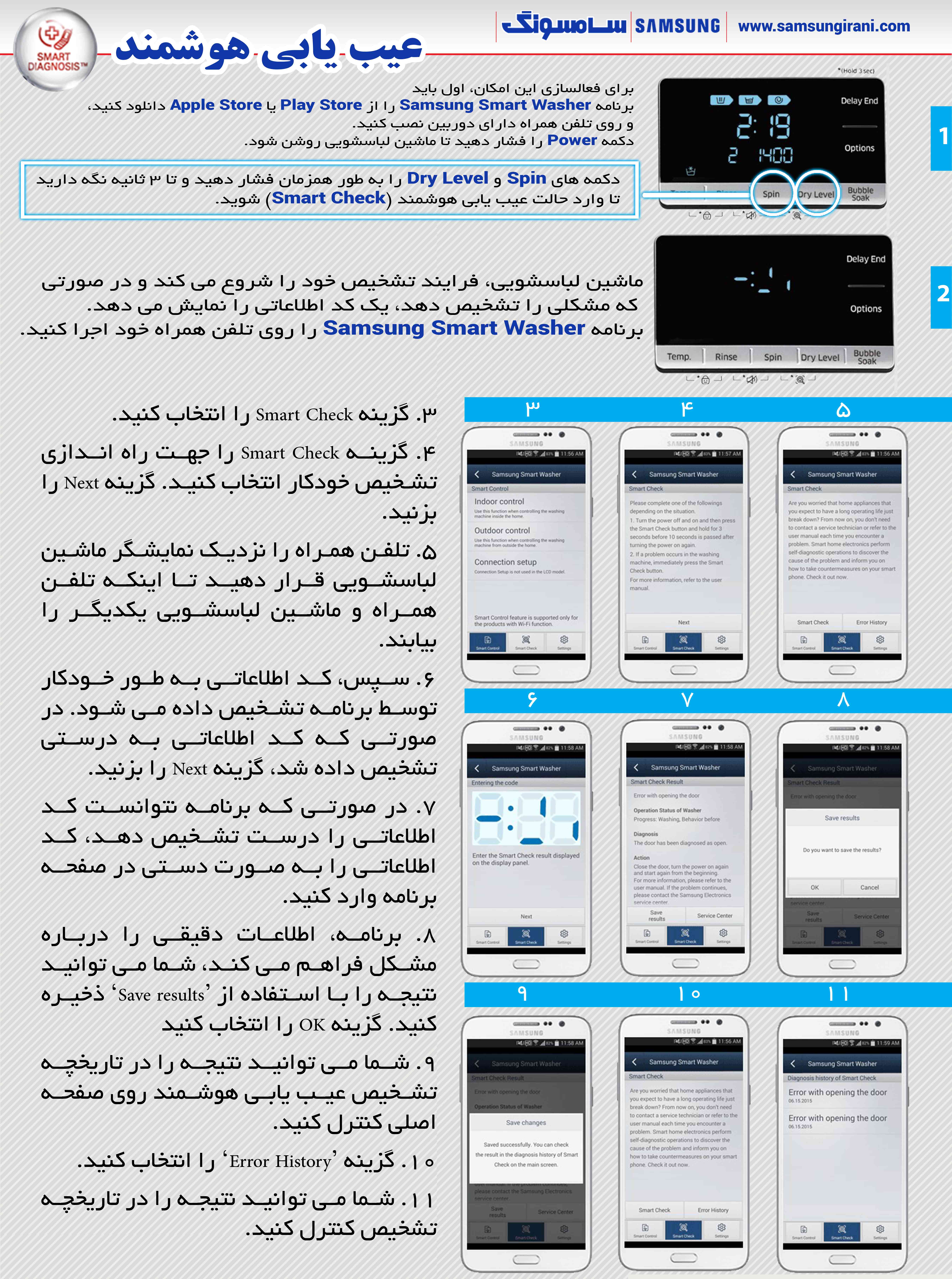 سیستم عیب یابی اتوماتیک (Smart Check) مسائل ماشین لباسشویی را تشخیص می دهد و راه حل های ساده ای را با استفاده از برنامه تلفن های هوشمند ارائه می دهد که باعث صرفه جویی در وقت و هزینه تعمیرات می شود دردسرهای ناشی از تماس با تعمیرکاران را حذف میکند.
