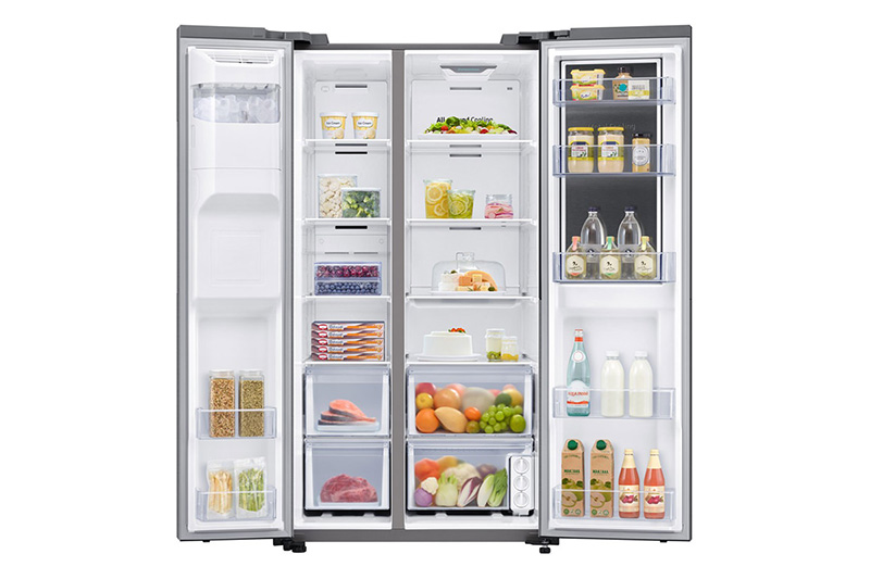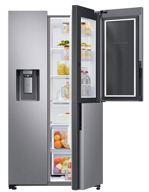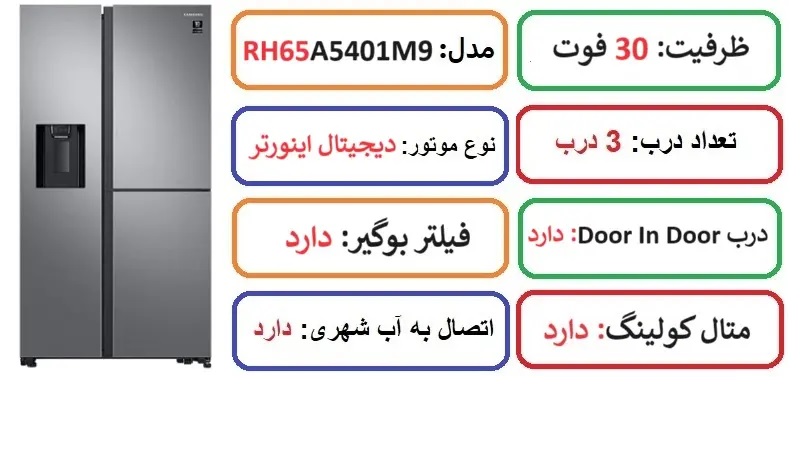 یخچال سامسونگ RH65 یک یخچال ایده آل برای خانواده با جمعیت متوسط 2 الی 4 نفر می باشد. چون ظرفیت این دستگاه که طراحی 3 درب دارد 30 فوت است. گنجایش این ساید بای ساید 628 لیتر است و آن را سی فوت می خوانیم. سمت راست این دستگاه یخچال و سمت چپ آن فریزر و روی درب یخچال یک درب بار (Door In Door) هم می بینیم. درب بار بهترین فضا برای مواد غذایی پر مصرف است چون ما را از باز کردن درب اصلی یخچال منع می کند. کشور سازنده این یخچال فریزر کره جنوبی اما مدلی که در ایران موجود است مونتاژ چین و کیفیت 100% شرکت سامسونگ را دارد. در این یخچال سامسونگ قابلیت های فروانی وجود دارد تا به مصرف کننده کیفیت کار خوبی را بدهد. مثلا فناوری فرش فیلتر باعث حذف بو و 99.999% باکتری موجود در یخچال می شود.