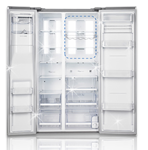 استفاده از سیستم روشنایی Dual LED برای روشن کردن فضای داخلی یخچال نه تنها فضای داخلی آن را روشنتر میکند، که بهعلت کوچک بودن این چراغها در مقایسه با لامپهای قدیمی، میزان گنجایش آن را نیز بیشتر میکند. از طرفی مصرف انرژی و گرمای تولید شده توسط دستگاه را نیز تا حد زیادی کاهش میدهد و باعث میشود تا دمای درون یخچال بالا نرود.